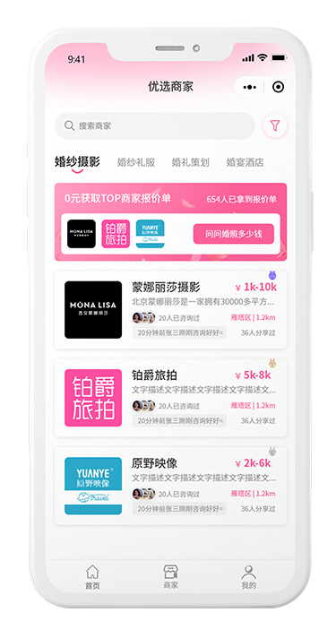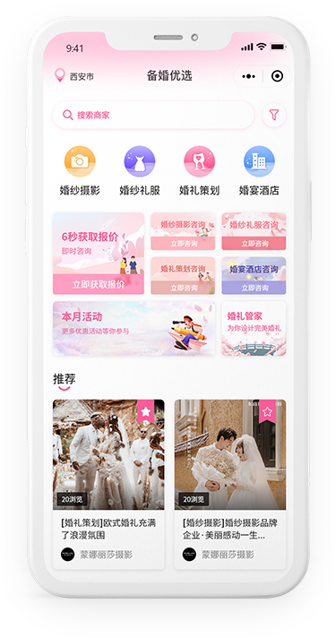 一个专注于婚礼承包的平台,包含婚纱摄影、婚纱礼服、婚礼策划、婚宴酒店于一身。不管你需要的是中式、欧式、简约或者小清新的婚礼,我们都能满足你!
